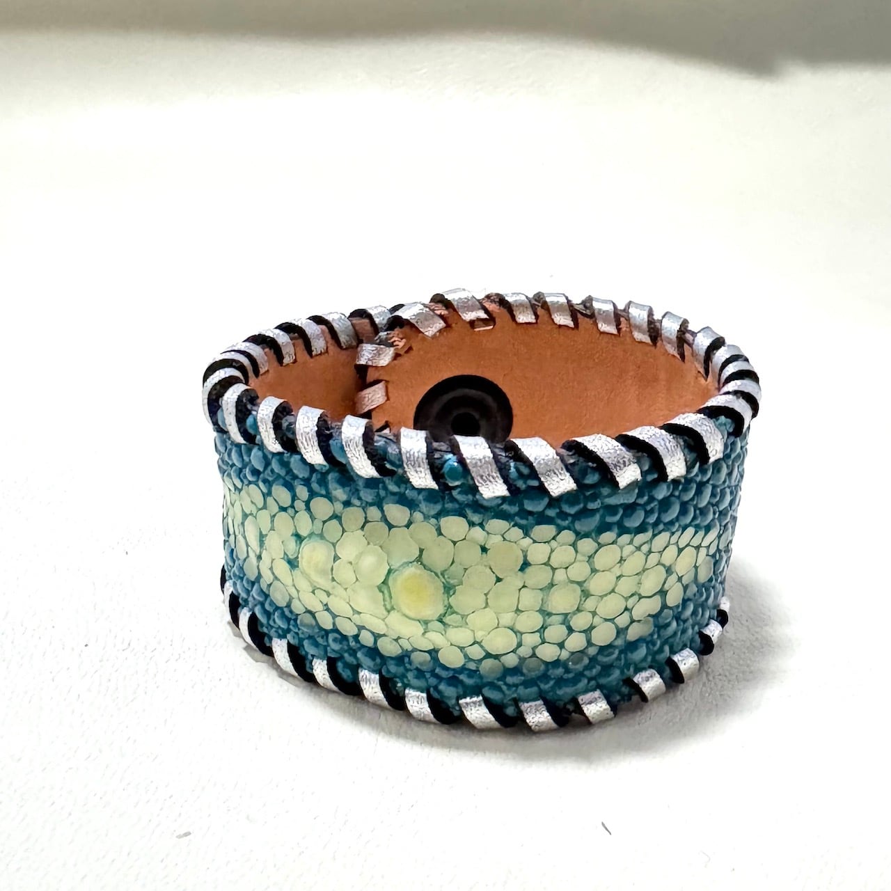 繊細な美しさを持つLeather Braceletの新たな魅力をぜひ体感してみてください。このブレスレットは、ターコイズのスティングレー革を使用しており、特に贅沢にスティングレーのど真ん中のスターマーク部分を取り入れています。手首周り約175mmのサイズ感は、カジュアルからフォーマルなシーンまで幅広く活躍し、シンプルながらも特異なデザインが装着することであなたのスタイルに映えます。